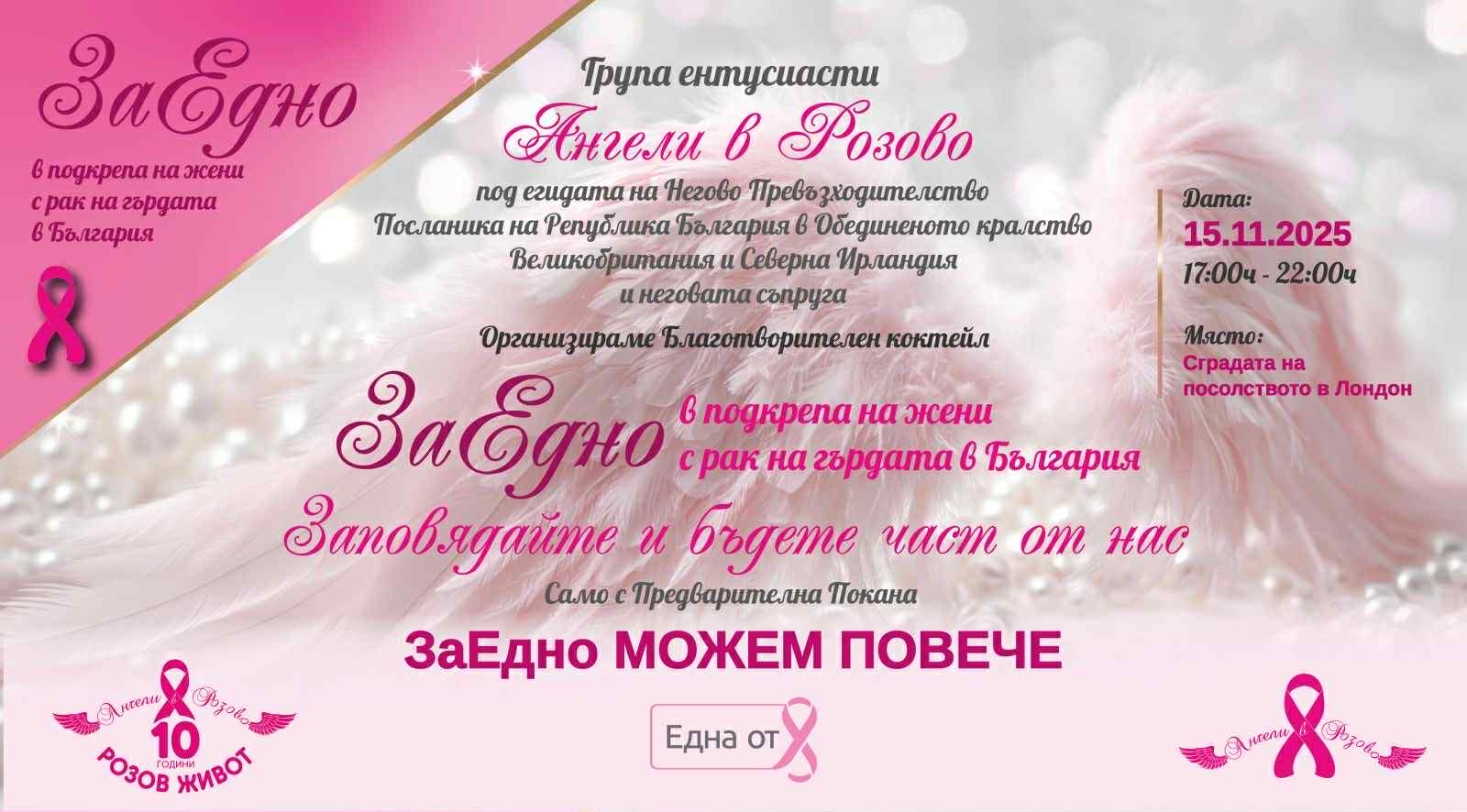 Каузата за подкрепа на жени с рак на гърдата е ежедневна, също както и борбата. Затова инициативата „АНГЕЛИ В РОЗОВО“ организира благотворителен розов коктейл за първи път в Посолството на България в Лондон. Той ще се проведе на 15 ноември тази година и е под егидата на посланика г-н Тихомир Стойчев и неговата съпруга доктор Любка Стойчева.