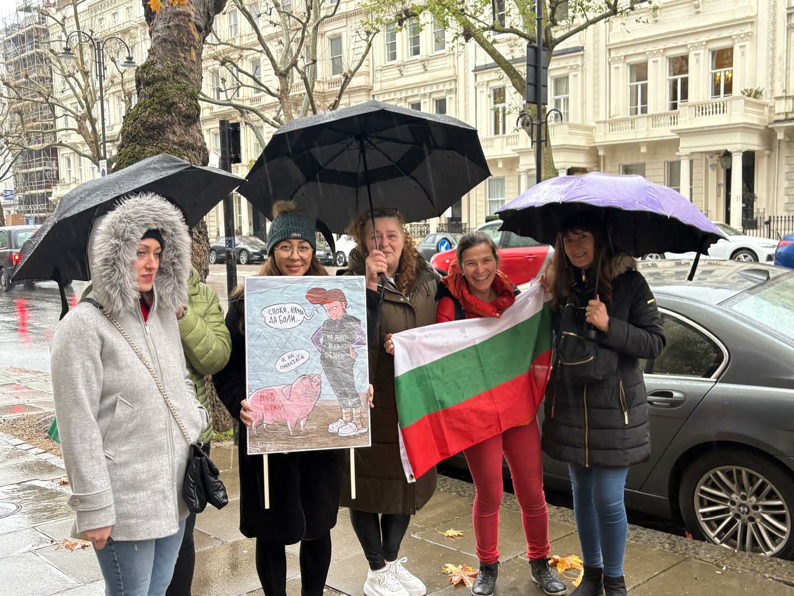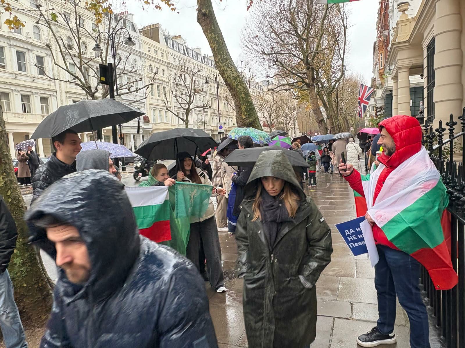 Въпреки обилния дъжд десетки българи, които работят и живеят на Острова, се събраха пред Посолството на България в Лондон на протест. Така те подкрепиха исканията на десетки хиляди българи в родината, които излизат на многолюдни демонстрации през последната седмица.